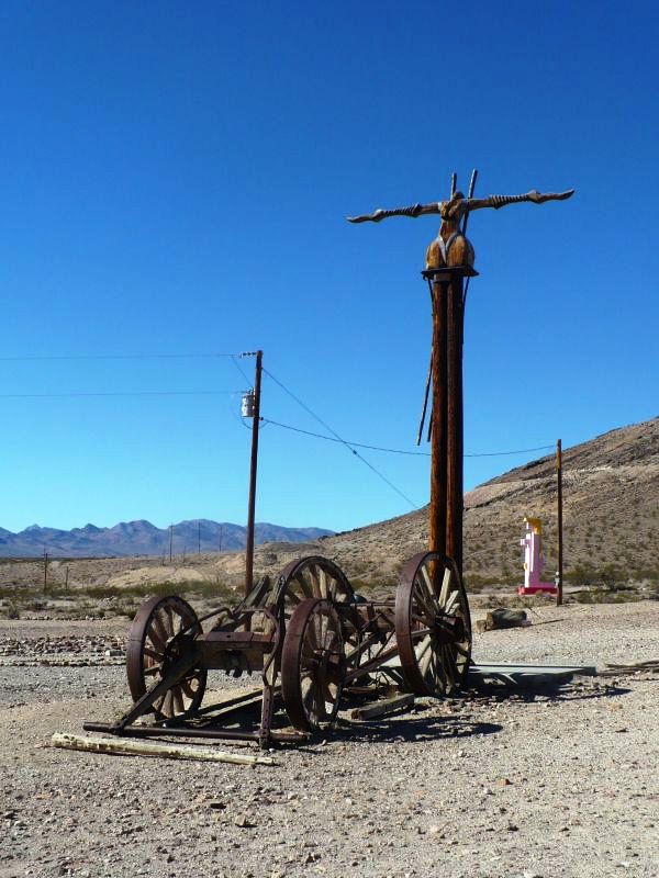 Следующая остановка - город Rhyolite (Риолит), расположенный в 115 милях к северу от Лас Вегаса, назван так по имени породы, содержащей золото. Находится он также в Неваде, на шоссе 374, перед самым вьездом в парк "Долина Смерти".