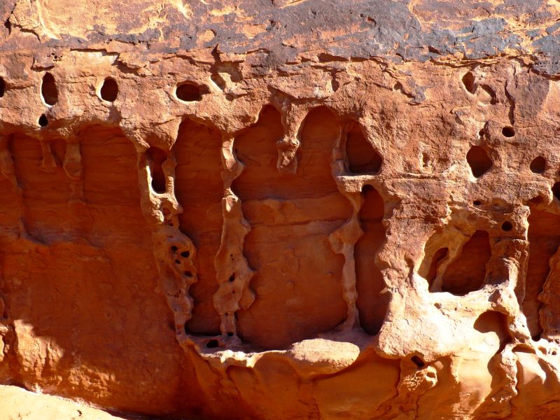 Выветривание коснулось не только арок и массивных каменных глыб. Ветер, вода и солнце хорошо поработали и над каменными стенами.