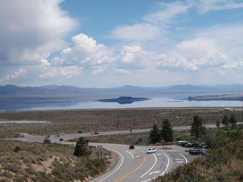 Попетляв по альпийским лугам Сьерра Невады, 120 дорога спускается вниз, в долину и здесь, около пересечения 120 и 395 дорог открывается вид на озеро Моно. На первый взгляд оно мало чем отличается от других озер Калифорнии. Уникальность озера заключается в его месторасположении. Оно расположено в долине, на границе штатов Калифорния и Невада, недалеко от пустыни Невада. В озеро впадает несколько речушек. Но ни одна не вытекает. Вся поступающая в озеро вода испаряется.
