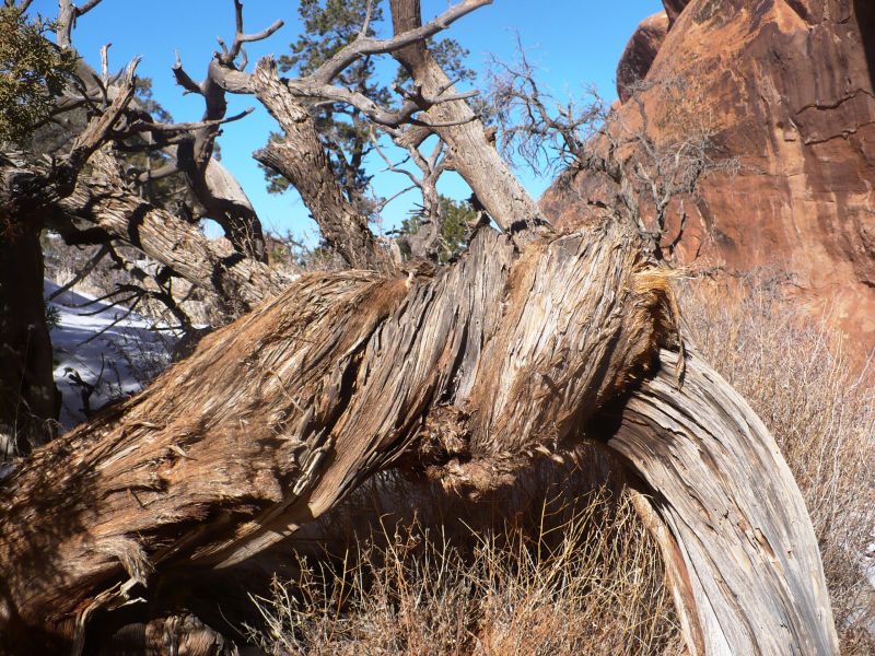 Чтобы выжить в тяжелых климатических условиях, ствол у немногочисленных  деревьев растет не прямо, а как бы закручиваясь вдоль своей оси.